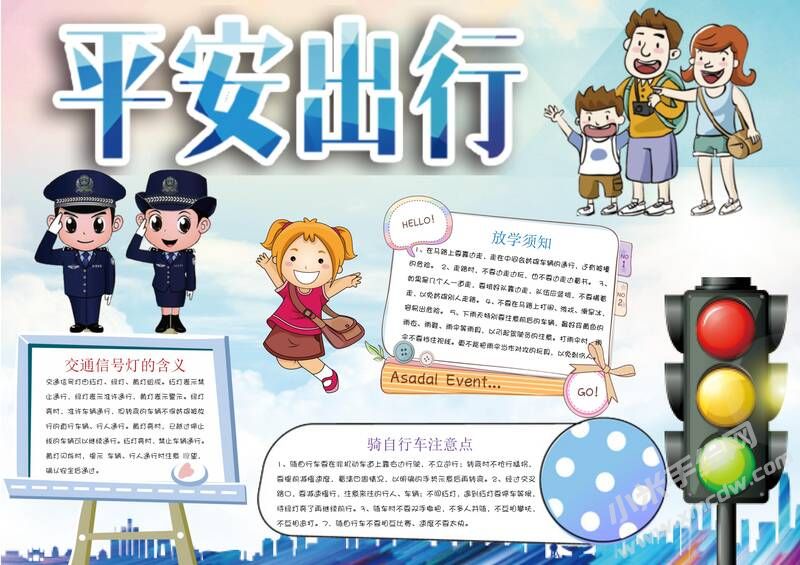 在手抄报空白处,添加与平安出行相关的插图,如交警在路口指挥交通、志愿者引导行人过马路、一家人文明乘坐公共交通等画面,传递积极的出行安全信息。