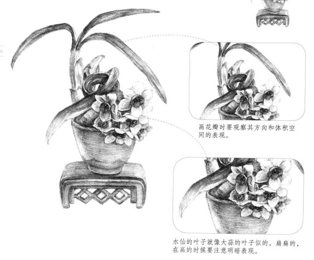 步骤四:从暗部开始添加阴影线条,大致表现出水仙花的明暗关系。