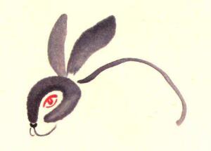步骤二:红色画眼睛,浓墨点鼻,中墨画嘴和兔背。