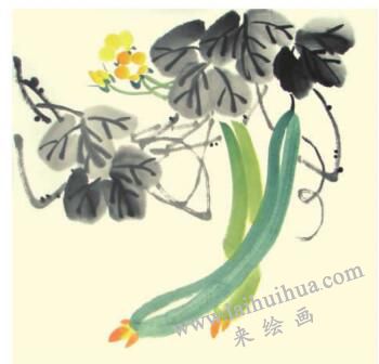 步骤二:藤黄加花青画出两根不同颜色丝瓜的基本形,前面深绿,后面稍呈黄绿。
