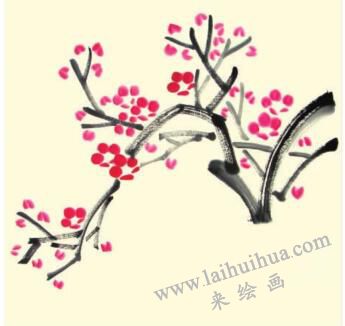 步骤五:用画花托的颜色点画花蕊。最后题名款,盖印章。梅花是国画中最常见的描绘内容之一,因为它有不畏严寒的习性,所以人们常用它来比拟人的高洁品格。