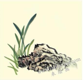 步骤二:先淡墨、后赭石皴染石块。调绿色,笔尖蘸墨有浓淡地从上到下画出叶子。