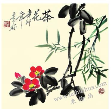 步骤五:绿色画竹子。这幅作品中的茶花由右上方出枝斜下,花朵在绿色竹叶的衬托下更显红艳。最后题名款,盖印章。