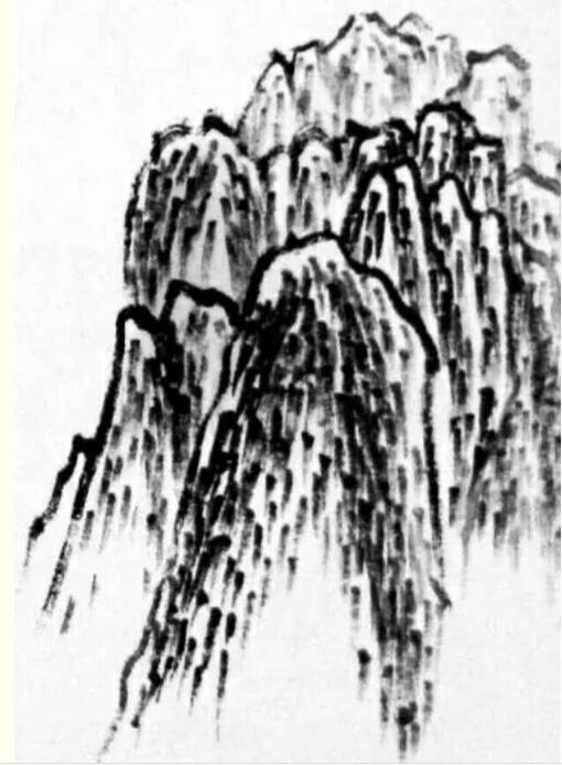 豆瓣皴的画法步骤01:用中锋勾勒出山石外形,山头部分用笔方折,表现出山石的坚硬感。
