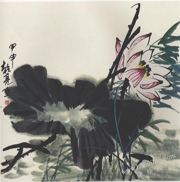 完成图:上色与画水草。上色先画花,花心要用藤黄、胭脂和曙红色,花瓣尖部色重一些,根部淡一些,淡红色勾花筋。画水草要看整体需要,可用双勾法也可用墨画。双勾水草后用石绿填染,最后用草绿色染一下水、叶、草、荷梗即可。