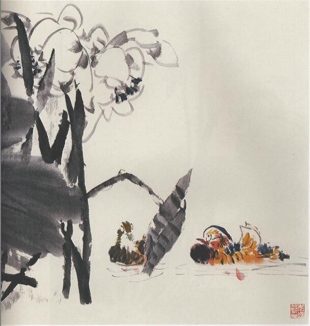 这是由左至右发展的画面,两叶一浓一淡,荷花用淡墨勾画。整幅画面除了鸳鸯用颜色以外,其余全都是用墨表现,以表现出墨分五色的层次感来。