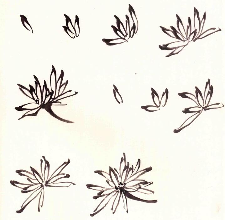 用狼毫笔调淡墨,中锋用笔勾花瓣,从花芯开始,由里向外,一层层画开来。注意用笔要肯定线条要流畅;花瓣与花瓣之间要有交错前后关系,以便表现花头的立体感。