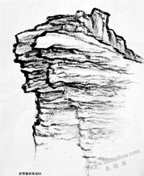 折带皴用中锋拖笔,再用侧锋转折横刮,向左行可逆锋向前,再转折向下,画出的墨线如“折带”,因此而得名。这种皴法用以表现方解石和水层岩的结构。元四家之一的倪云林喜画折带皴,用“渴笔”(笔头含水很少)画出,虚灵秀峭,极有艺术魅力。
