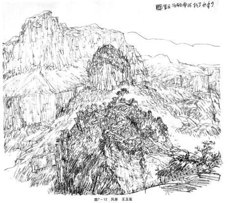 在深入表现时要注意始终把握近、中、远景物的区别,分清主次关系。整个画面以表达作者对说物情感为依归,切切忌喧宾夺主,被个別次要的衬托景物吸引,最后造成主次不分,画面缺乏感情等问题。素描风景写生技法多样,要适应不同景物运用,甚至创新。从来没有一种万能的技法可以用来表现各种物,包栝中国山水画的皴法也会因对象而有各种差异(图7-10)。