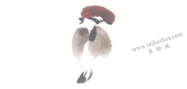 步骤三:赭墨画背,两笔画翅。稍重的墨勾嘴。