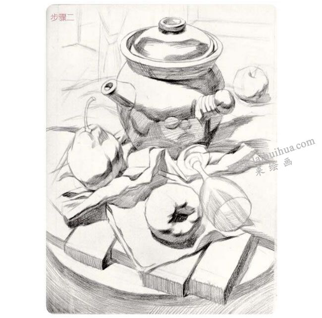 步骤一:观察整钽静物,注意台面立面三个转折面的空间分布。并且要对比主体物陶罐与水果、玻璃杯不等物体的大小、位置、比例等关系。