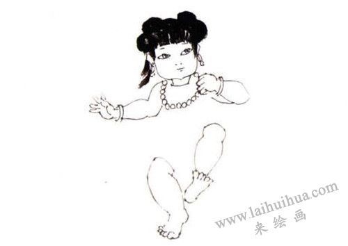 三、用曙红色画女童的裹肚。