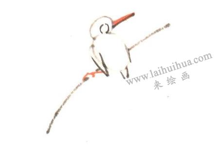 图二、进一步勾画眼圈、翅、尾,用橙红色画出翠鸟的嘴和爪。