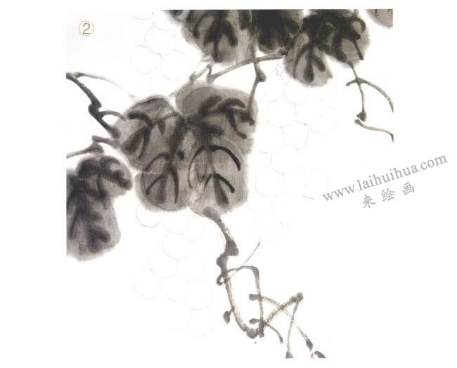 ④用浓墨点葡萄的果脐。另用淡赭石在藤上复染一遍。