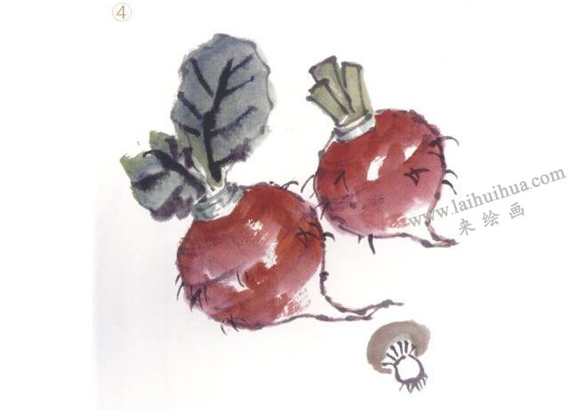 ④用浓墨勾出叶筋,并在萝卜的身上加画一些小须及加一个小磨姑。