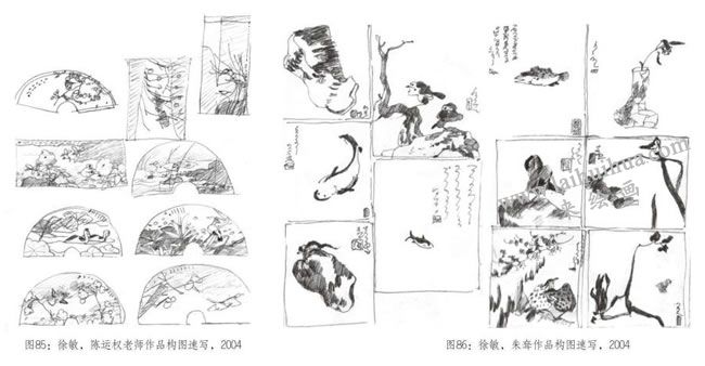 一般这种构图训练要产生较好的效果,需要每天临摹20个左右小构图,才能形成构图美感趋向,形成创作构图习惯。在临摹学习构图过程中,不要因为是创作工笔花鸟画而排斥其他的构图,良好的构图感觉形成并不分派系,只要是构图感觉强烈的画面都可以临摹,如山水画、人物画、油画、水彩、版画等,只要是有优美的构图关系都能为创作服务,而且中国画创作有时要推陈出新,表现时代特征,与其他画种的交流也是极为重要的。(图85、86)