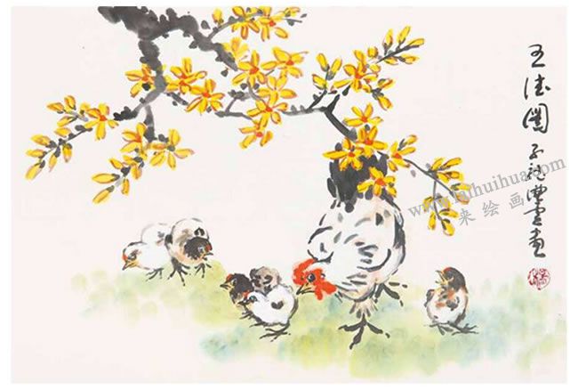 此幅画迎春花是近景,群鸡是远景,从而产生空间感的艺术效果,相互掩映,也会使画面更加丰富多彩。
