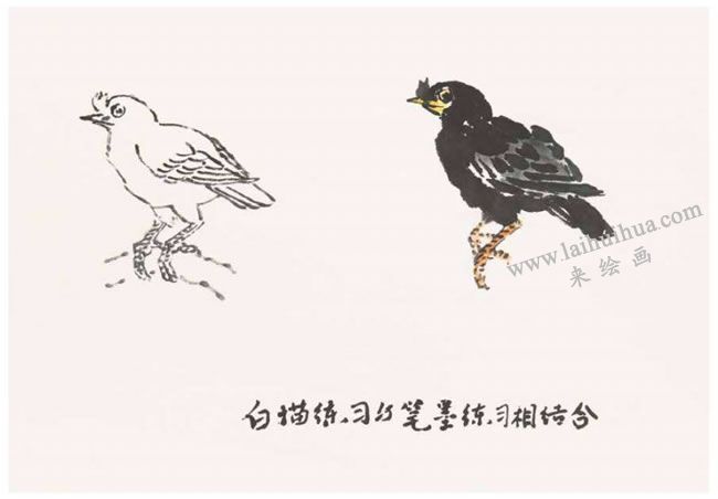 八哥是中型鸟,为了准确把握形态结构,也可以先以白描着手,然后再以笔墨关系概括取舍进行创作。