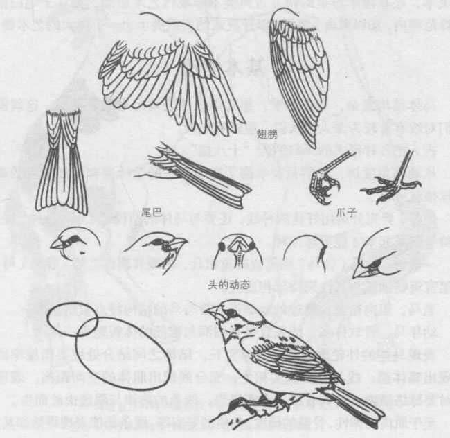 鸟的头部呈卵形,躯干似蛋形,即两个大小不一的球体。注意了这两个球体的透视关系,禽鸟的大关系就基本抓住了。然后再在这两个不同角度的球体上“安装”上其他几个部位:颈、头、翅、尾、腿脚,这样,复杂的结构与动态关系就变得简单而易解了。