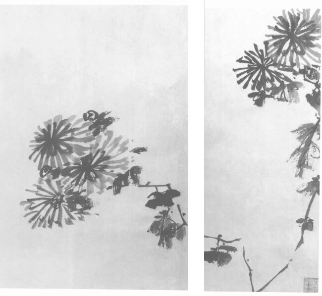 ⑤右上方的菊花中,一朵为正面花,另一朵为背闸花。描绘方法与左侧菊花相同,但要注意用墨。