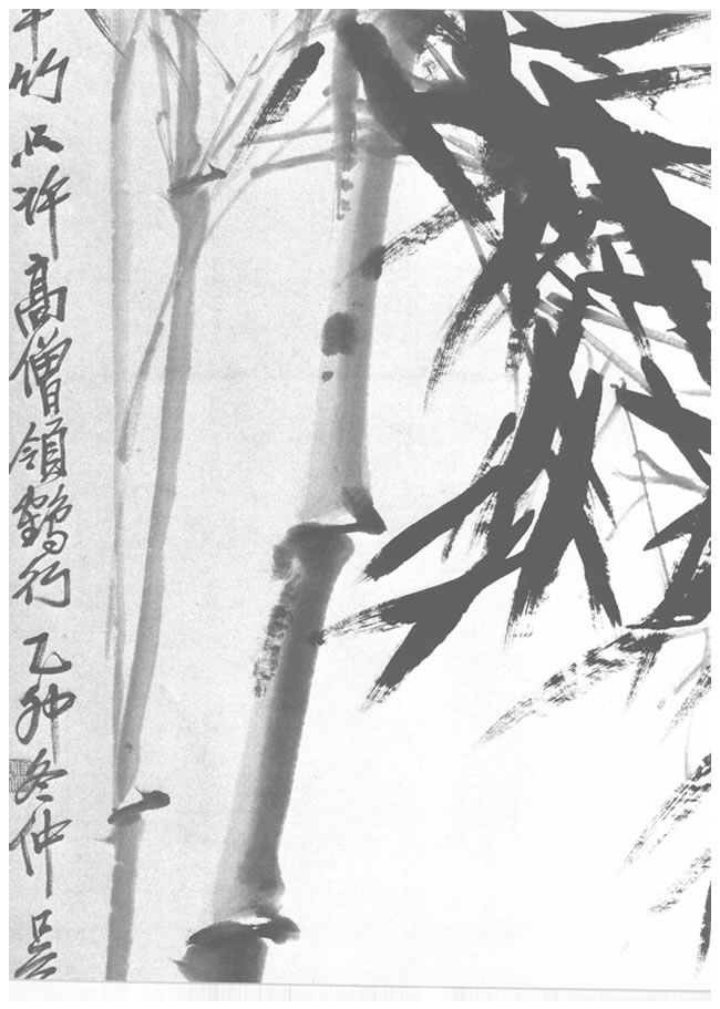 画家以锐利而迅捷的拂笔描绘出竹叶。在竹叶的顶端,画家让笔尖散开,造成K白的效果。画家使用钝笔,墨色为焦墨(非常浓的墨)。