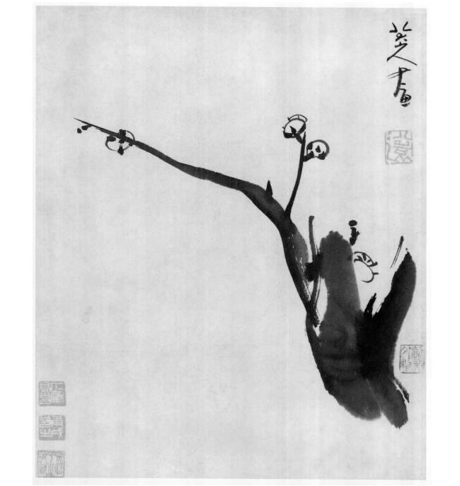 梅花悄悄地开在荒野中,是历尽风霜后的殊枝伤干及稀疏的凋花。八大山人擅长处理单纯简洁的画面,只用寥寥几笔就画出了孤寂凄楚的环境。这是发挥八大山人特长的作品,也是代表17世纪写意画风的典范。