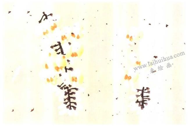 用羊毫笔先蘸少许藤黄(或淡绿)调匀,宜淡不宜浓,浸入笔根。然后蘸白色略调,使笔尖处浓厚,画法同画紫色相同,用此方法最好是画、色纸上,如果画在白纸上,待干后要在花的周边以淡绿或淡赭渲染,以衬出白花。