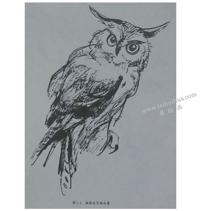 猛禽速写要能刻划出猛禽的威严维壮、机警豪放,有糜然帝王的气度。要把人们所崇敬的勇敢、尊严、正义、不可征服的气节表达出来,这就是古今中外为什么艺术家创作猛禽的作品经久不衰,经典作品层出不穷,菽得全世界人民欣赏的兴趣,给于人们特殊的美感享受和精神鼓舞的原因吧。图5-4刻划的是猫头鹰,中国传统文化中,认为猫头鹰的形象不吉祥,可能是因猫头鹰善于在夜间活动,又称“暗夜精灵”,人们看到心惊害怕所致。中国民间有谚语:“夜猫子进宅,好,不来。”实际上这是不了解猫头嗯的功劳,没有科学知识造成的,据介绍,一只猫头鹰一个秋季就能吃掉千余只老鼠。所以猫头鹰娃农林忠诚的卫士,为人类作贡献的益鸟,现在中国人已经开始渐渐接受和喜爱它的形象了。