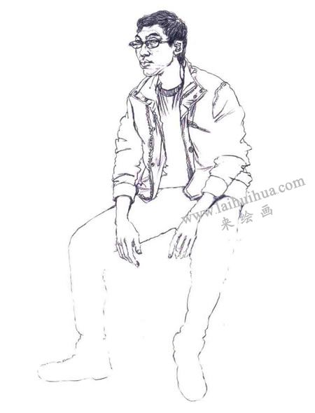 步骤四:裤子的用线与上衣要有所区别,质感的表现可以体现在线条的粗细与韵味上。坐着的动作,姿态丰富,衣褶密集。在造型时,注意动态的变化,多用斜线纠形原理把握每个体块的斜度。图中模特两脚分幵,双手搭在大腿上,重心稳定,动作特点鲜明。在用线表达形体方面,结构内在灵活松动,充满节奏感。
