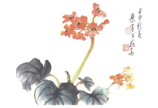 步骤一:羊毫笔蘸朱黄、洋红写花,五瓣,墨红点花蕊,朱黄写花筒。草绿蘸朱红写花茎,趁湿以清水之笔弄扁撇茎毛。