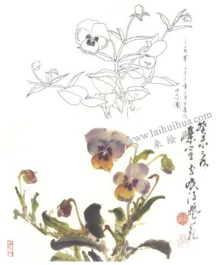 步骤一:羊毫笔蘸淡粉、藤黄写下面中央之瓣,另以淡粉和以紫色写上面四瓣。近花心处三瓣的瓣根点以深紫,以紫色尖毫勾花筋。