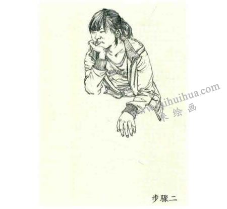 步骤二:进一步画手臂、躯干,衣纹刻画要结合袖子的结构。注意两件衣服之间的前后关系。