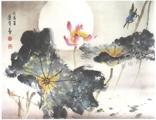 步骤七:构图如有未足,补以蜻蜓或小鸟、野草、浮萍。