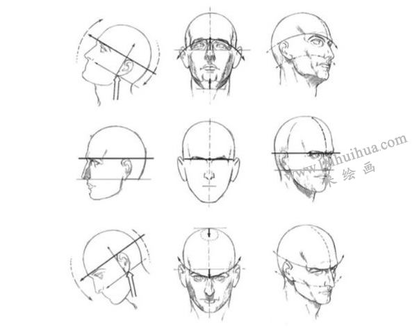 头部可理解为立方体,靠圆柱形的颈部支撑。颈部是人体比较灵活的部位,它的扭动关系直接 影响头部面向的变化,产生不同的透视。常见的有俯视、仰视、平视、侧视,这几种透视变化使头 部各部位的比例关系发生一定改变,要仔细观察和理解。标准的脸部比例可大致分为“三庭五眼”: