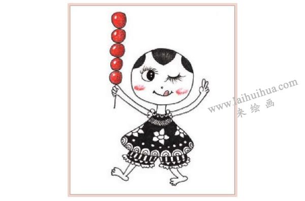 步骤四:用彩色铅笔给糖葫芦上色,注意留个小亮点,再给福姓宝宝画出两个红红的脸蛋吧!