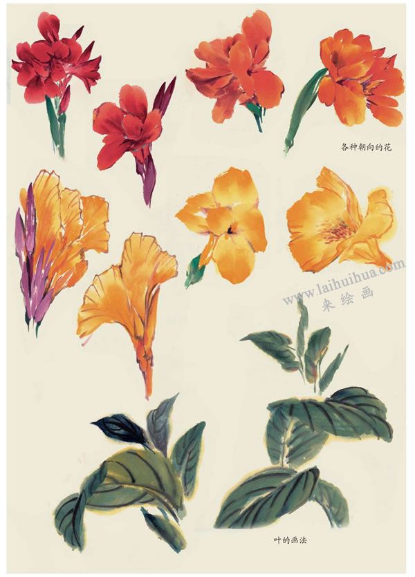 花、梗、叶组合:要注意冷暖色与浓淡的衬托,叶要介叫背、转折以丰富画面,增加情趣和意境。