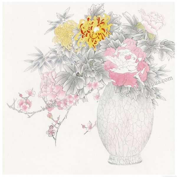 步骤四:牡丹叶、菊花叶用绿色罩染后,根部继续加重。牡丹花、菊花、梅花、花瓶调整加重,然后复勾。梅花枝干用淡墨点染。牡丹主花用大红加钛白调成淡粉色,整体罩染,把浮色用清水洗干净,使之成为柔和色的深紫花,然后再复勾。花心用藤黄加钛白调浓点蕊。最后整个画面进行调整,要浓淡适中,层次分明,完成后题款盖章即可。