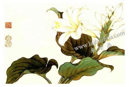 步骤四:用赭石罩染老枝干,三绿分染叶端。玉簪花分雄蕊丝及雌蕊.雄蕊丝用略浓的白粉勾勒.雌蕊用藤黄加白粉调均后点花粉。