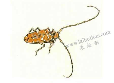 步骤四:用藤黄分染触角的根部,用稍浓一些的白粉点画天牛背部的白点。