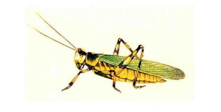 蚱蜢外形像蝗虫,雌虫比雄虫大,体绿色或黄褐色。其头尖,呈圆锥形:触角短,基部有明显的复眼:后足发达,善于跳跃,飞时可发出"札札"声:有咀嚼式口器。
