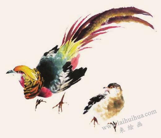 勾出锦鸡嘴眼,重墨点眼窝。侧锋勾出冠羽及扇形颈羽,用墨由深至浅,由实至虚。点颈羽斑纹,染赭黄色。花青加墨画背部,重墨积斑。淡墨勾三级飞羽,重墨点人飞羽,朱砂蘸胭脂大笔点腹部。再用黄调赭石,胭脂加墨画长尾,趁色未干以重墨圈纹,赭红色画尾上覆羽。雌鸟主要用淡赭加墨点染胸部,色较单纯一些。脚爪可直接画,也可以先勾后染。