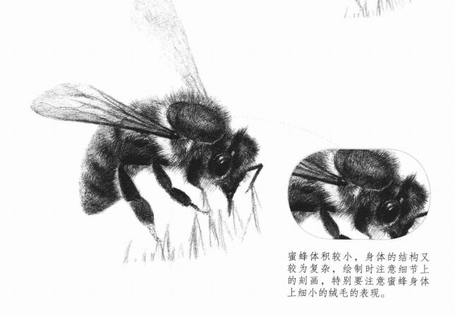小贴士:蜜蜂体积较小,身体的结构又较为复杂,绘制时注意细节上的刻画,特别要注意蜜蜂身体上细小的绒毛的表现。