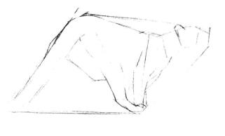 3、将暗部加重,画出身体基本的大体积感。注意前腿和后腿并不是从肚子下方直接长出来的,支撑它们的骨骼从后背开始延伸出来。