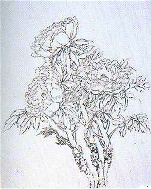 以双钩填彩的中国国画法表现此幅牡丹国画;选用叶筋笔依至善之旅的写生稿作白描,钩花瓣的线条稍淡,叶子线条稍浓。