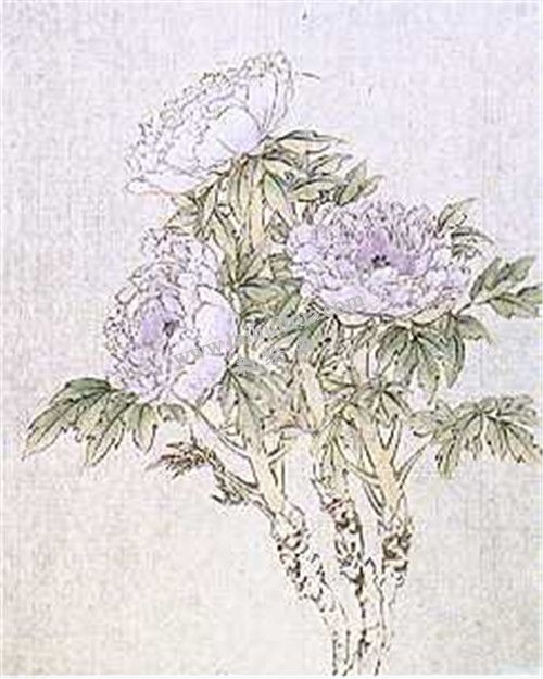 此幅牡丹国画的叶子以淡花青晕染半边,淡紫色晕染花瓣。设色须淡,多染几次的效果较佳,一次涂太浓,则不易均勺。