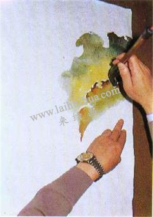 国画荷花绘画步骤第二步——叶的正面靠近中央部分先用藤黄涂写,未干前再接染草绿及浓墨,使色彩丰富有变化。