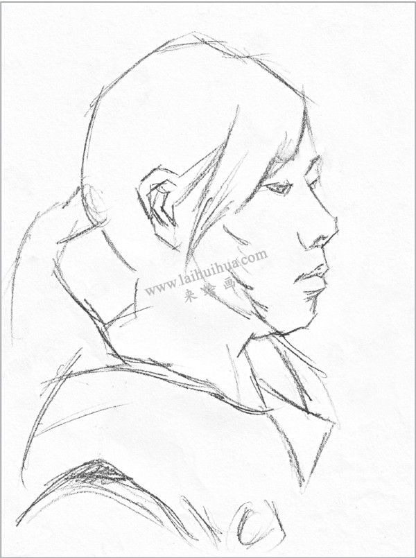 1.注意侧面人物的外轮廓线大致变化,用大直线勾画出来,注意头、颈、肩部的连接关系,抓住人物动态的第一感觉。