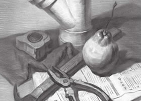 生活用品类组合素描画法步骤示范。面对一组文体生活用品的静物组合......