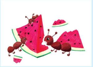 小蚂蚁,大西瓜,多少蚂蚁才能吃完一个西瓜呢?蚂蚁兄弟们,快来帮忙吃西瓜!