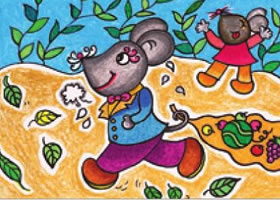步骤四:运用褐色系的点彩法涂画土地,绿色系的漸变法涂画草地。涂画时,颜色不要涂到线的外面。